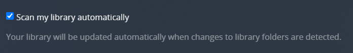 When a change is detected in the source location for a library’s content, the appropriate library will be scanned. This function relies on the computer’s operating system providing the “something changed” trigger. Some operating systems don’t provide this trigger and content mounted via a network will also typically not work. If your library doesn’t automatically scan, you may have to set a periodical scan or do it manually.